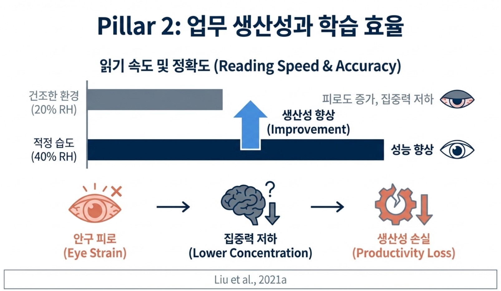 건조한 환경은 눈물막의 파괴를 가속화하여 안구 건조 증상과 피로도를 높입니다.