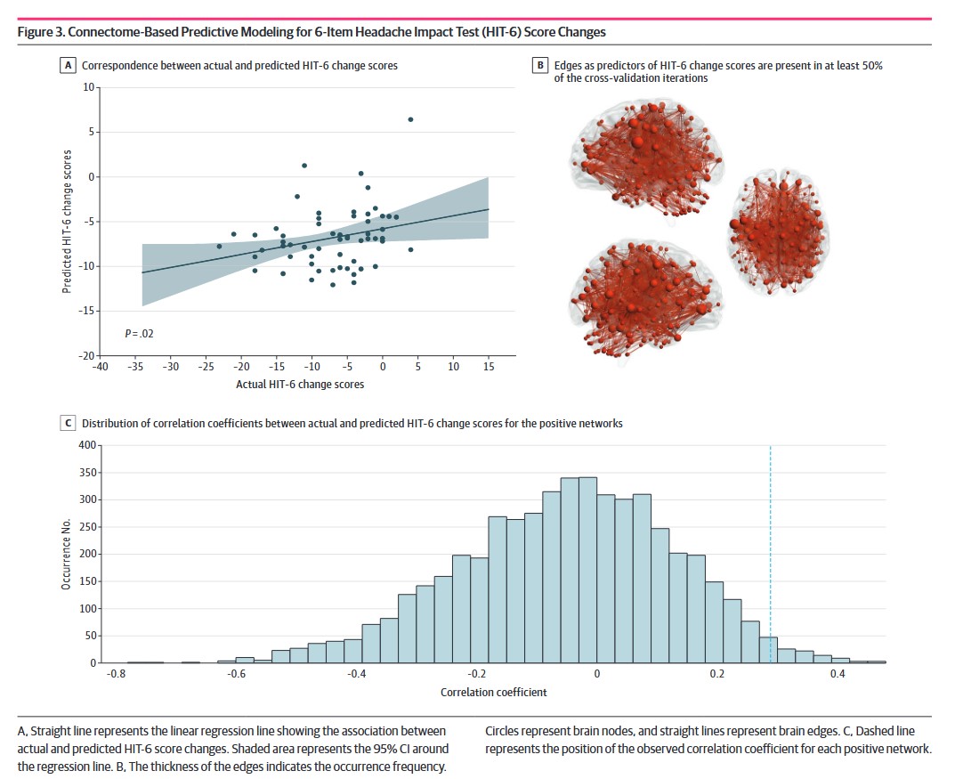A. 네 전조증상이 없는 편두통 환자 120명을 대상으로 한 무작위 임상 연구에서, 침치료는 통증 완화 및 기능 개선에 효과적이었습니다. 이러한 효과는, 연결체 기반 예측 모델링(CPM)으로 예측할 수 있는 것으로 나타났습니다.